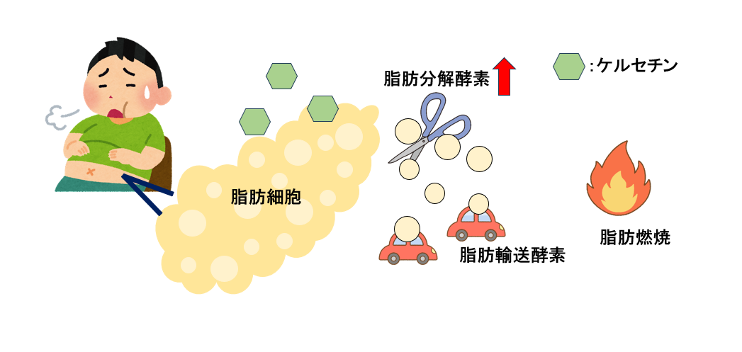 ケルセチンが脂肪組織まで達すると、脂肪を分解する酵素を活性化、脂肪の分解を促して体脂肪の減少を手助けするんだ。